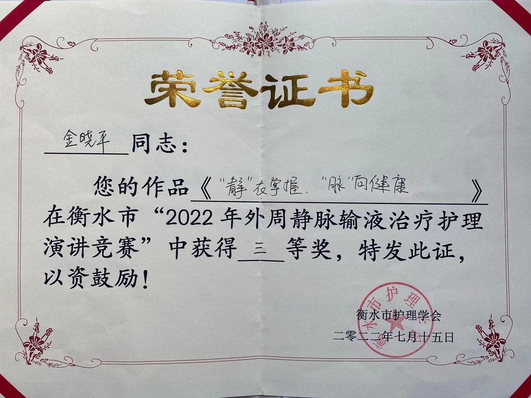 隨著護(hù)理專業(yè)的不斷發(fā)展,靜脈治療已成為涉及多學(xué)科知識(shí)與實(shí)踐的專業(yè)領(lǐng)域。為了在靜脈治療領(lǐng)域培育更多更專業(yè)的人才,讓最新的管理工具及思維應(yīng)用于實(shí)際臨床工作,我院外二科護(hù)士金曉平參加了衡水市護(hù)理學(xué)會(huì)聯(lián)合靜脈治療專業(yè)委員會(huì)于2022年7月15日舉辦的“2022年外周靜脈輸液治療護(hù)理演講競(jìng)賽”。
