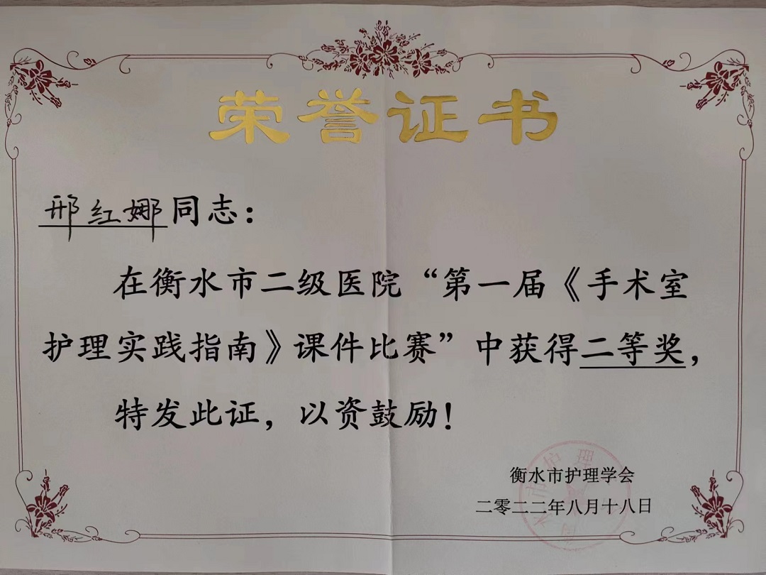 我院邢紅娜護(hù)士克服緊張情緒,按照平時(shí)的練習(xí)狀態(tài)將最優(yōu)秀的一面展示在大家面前,終在決賽現(xiàn)場穩(wěn)定發(fā)揮,獲得二級醫(yī)院二等獎(jiǎng)的成績。