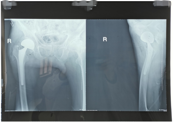 近期,我科又為兩位高齡老人因股骨頸骨折行髖關節(jié)置換術。一位是呂大爺,82歲高齡,右髖部外傷后疼痛一個月就診。當時呂大爺外傷后局部疼痛,未引起注意仍日?;顒?,癥狀逐漸加重后就診,既往有高血壓、腦梗塞、腦出血病史,入院后積極完善術前評估,在無絕對手術禁忌癥時行右側股骨頸骨折髖置換術,手術時間短,出血少,術后第二天呂大爺扶助步器下床活動,避免了因骨折長時間臥床各種并發(fā)癥的發(fā)生,老人及家屬對我們的治療非常滿意。(見下圖)