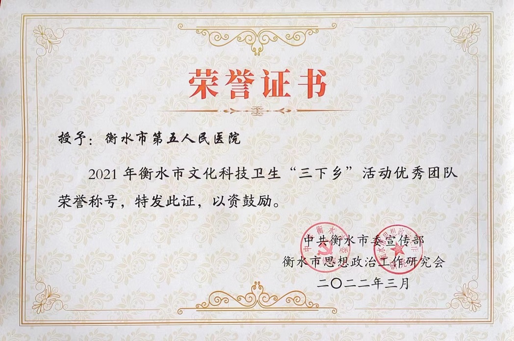 近日,我院被中共衡水市委宣傳部、衡水市思想政治工作研究會授予“2021年衡水市文化科技衛(wèi)生‘三下鄉(xiāng)’活動優(yōu)秀團隊榮譽稱號。
