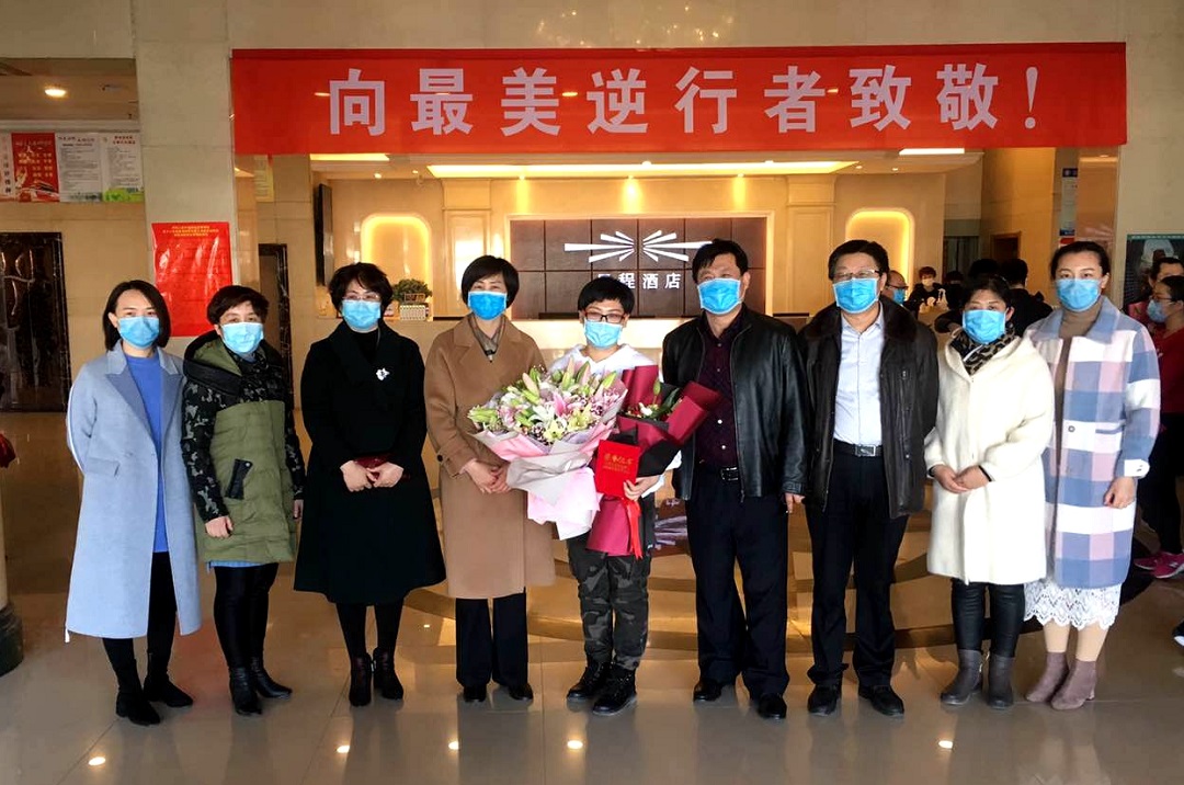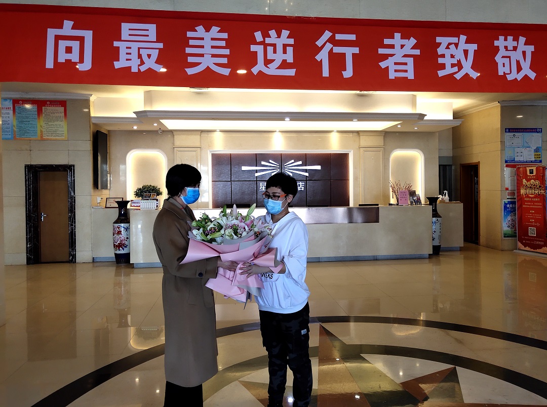 3月3日上午,我院王玉新院長、李建梅副院長一行專程迎接圓滿完成支援任務(wù)并順利解除隔離的任志新同志凱旋。王院長為任志新獻(xiàn)上鮮花。