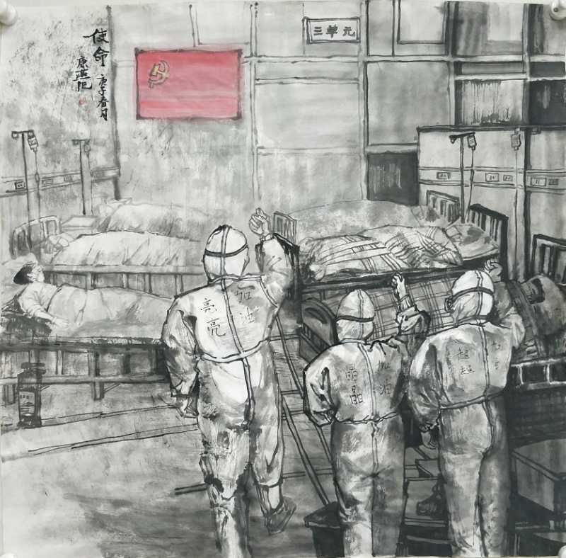 兩首詩寫完之后,蘇國強(qiáng)將這兩首詩寫成了書法作品。意猶未盡的賈主任,又把自己的想法告訴了好朋友康燕,康燕是一名畫家,聽了“亮晶晶超級組合”的事跡后,也非常感動(dòng),短短幾天時(shí)間,就畫出了兩幅國畫作品《使命》 、《太行神韻》。《使命》激勵(lì)三位護(hù)士一定要不忘初心、牢記使命,堅(jiān)決打贏疫情攻堅(jiān)戰(zhàn);《太行神韻》則向沖向一線的河北支援湖北醫(yī)療隊(duì)致敬,祝愿他們把“太行山精神”展現(xiàn)在抗疫前線。