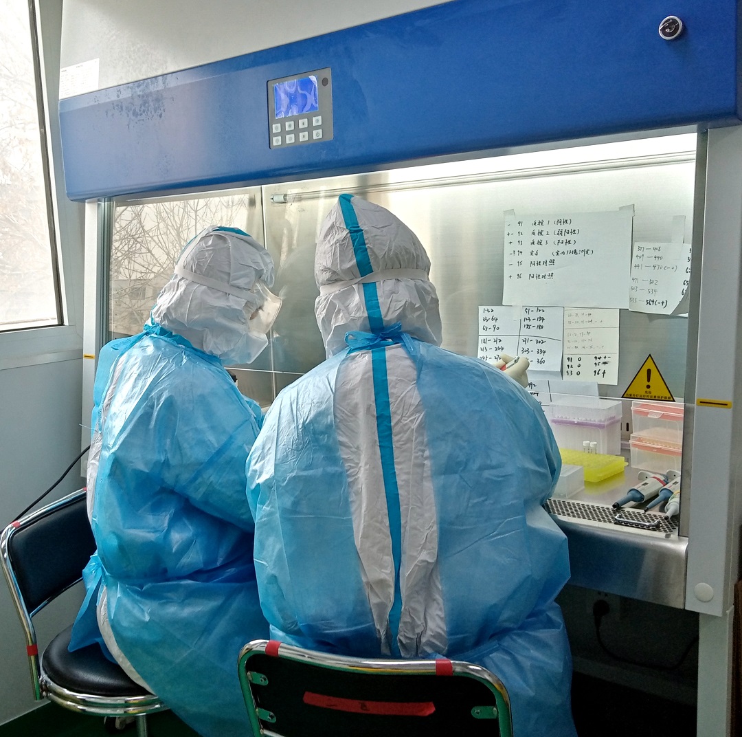 核酸檢測需要高度集中注意力,每一步操作都不允許出現(xiàn)絲毫差錯。尤其是二區(qū)的檢驗者,每天開蓋、閉蓋、加樣,一個動作要重復幾百次,從實驗室出來后都是腰酸背痛,筋疲力盡。他們穿著厚重不透氣的防護服,戴著N95口罩、護目鏡,窗外是數(shù)九寒天,室內卻汗流浹背。為了能多工作一段時間,多節(jié)省一套防護服,他們進實驗室前從來不敢喝水,嗓子干得要冒煙,手中操作卻不曾停歇。大家身體是疲憊的,精神是高漲的,斗志是昂揚的!