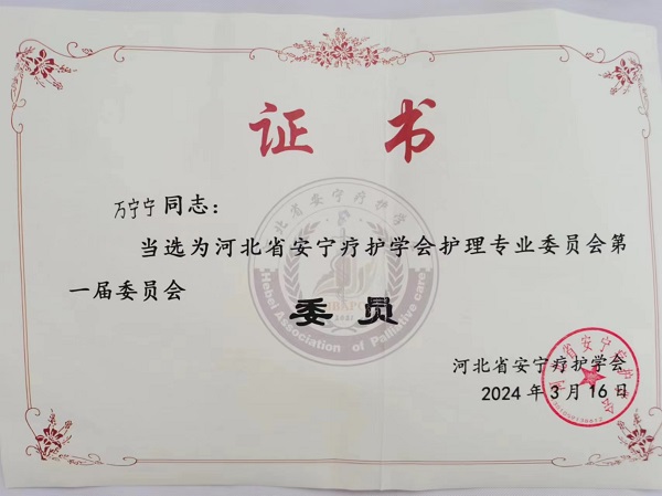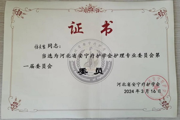 我院外一科護(hù)士長(zhǎng)徐靈雪、外二科副護(hù)士長(zhǎng)萬(wàn)寧寧當(dāng)選為河北省安寧療護(hù)學(xué)會(huì)護(hù)理專業(yè)委員會(huì)委員。