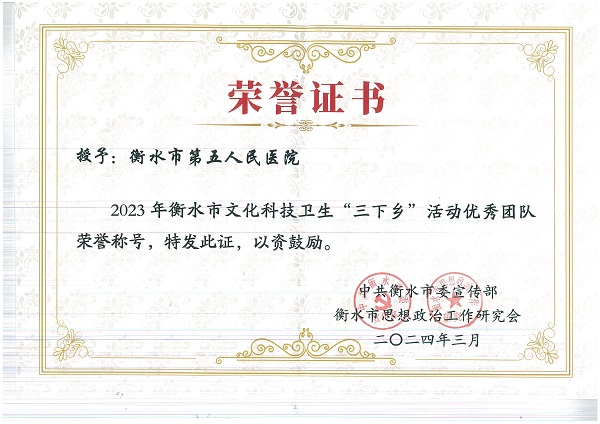 近日,我院被中共衡水市委宣傳部、衡水市思想政治工作研究會(huì)授予“2023年度衡水市文化科技衛(wèi)生‘三下鄉(xiāng)’活動(dòng)優(yōu)秀團(tuán)隊(duì)榮譽(yù)稱號(hào)。