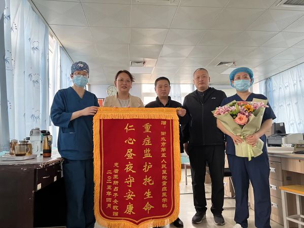 轉(zhuǎn)身兄妹倆又匆匆趕到六樓重癥醫(yī)學科。見到重癥科主任劉艷紅和護士長任志新的瞬間,王女士快步上前,將寫有“重癥監(jiān)護托生命,仁心晝夜守安康”的錦旗及鮮花送至劉艷紅和任志新手中,并鞠躬致謝。