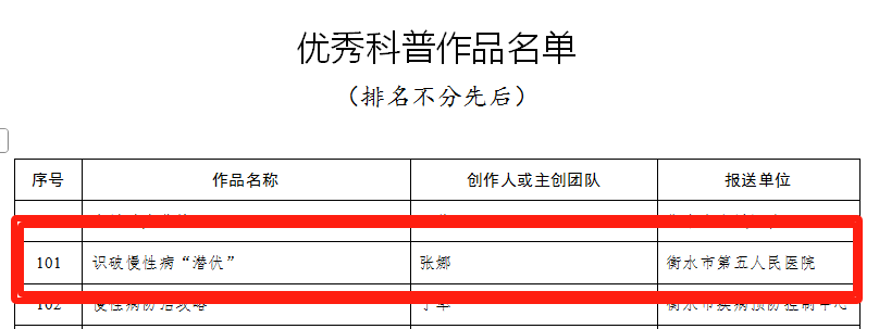 近日,河北省衛(wèi)生健康委公布了慢性病防治科普作品征集活動評選結(jié)果,此次活動全省共征集908件作品,經(jīng)專家評審,評選出107件優(yōu)秀科普作品,衡水市有7件作品入選,數(shù)量全省排名第四。